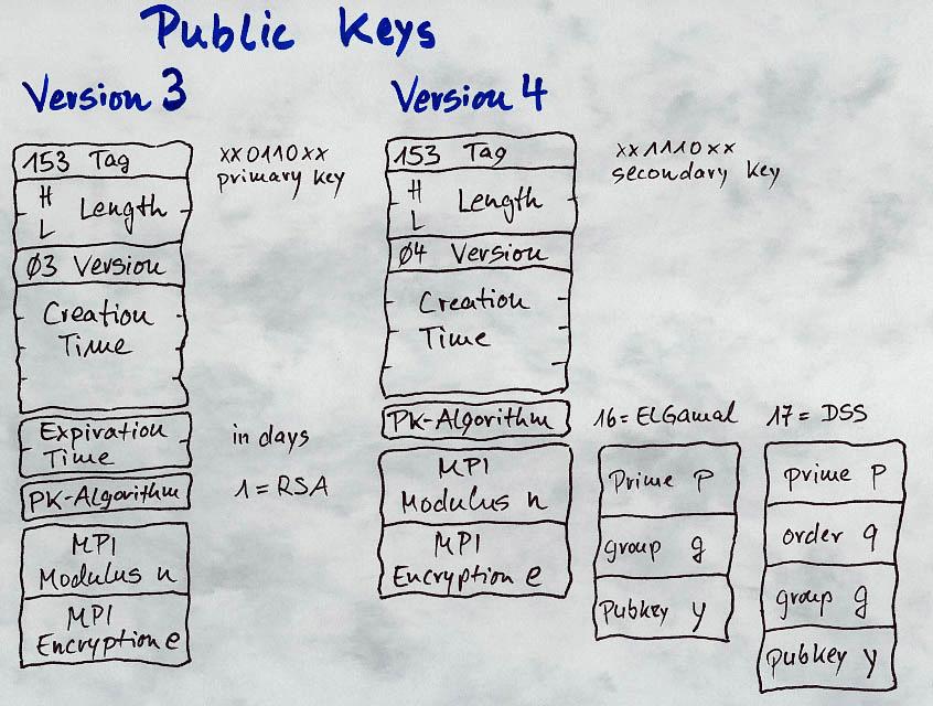 If you look at the packets which define the key-material the differences between Version-4 and Version-3 key-packets are not too impressive. Both start with the byte 153, which indicates a public-key-packet. Version-4-subkeys would start with 185. The next two bytes define the length of the whole packet in bytes and the third shows the version-number. The following four bytes give a number that indicates the key's time of creation measured in seconds since 1.1.1970. Version-3-keys then have two bytes which indicate the expiration time in days after creation and these two bytes are missing in the Version-4-format. The next byte gives the public key algorithm which can be RSA=1 for both and ElGamal=16 or DSS=17 for Version-4-keys. The rest of bytes hold "the essential key-material" which is two Multi-Precision-Integers for RSA and with Version-4-keys two, three, or four respectively. A Multi-Precision-Integer is a very long number with the length in bits stored in the first two bytes followed by all the bits that make up the entire number.