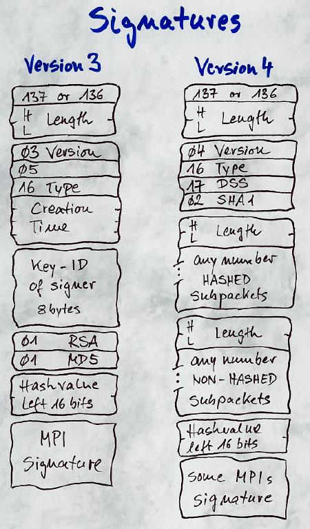As you can see Version-3 or classic signatures have no complicated design, after the usual byte 137 or 136 which identifies a signature and the packet length they contain a block of data comprising the version number and 5 bytes of data , the type of the signature, that means whether it signs a text or a key or a key with a user-ID, and the creation time. This block of 7 bytes will be hashed together with the data to be signed and will be protected by the signature. The rest of the signature-packet is the signer's key-ID, the public-key-algorithm and hash-algorithm, which always is RSA and MD5, and the first 16 bits of the 128-bit hashvalue which is encrypted with the signer's secret key and stored as a MPI at the end of the packet.
